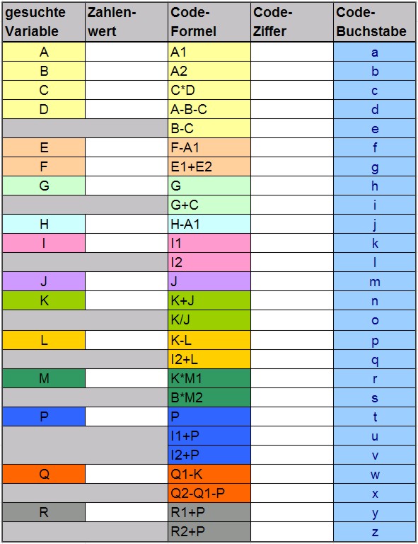 Druckt euch die Code-Tabelle und die Stage-Codes aus und ihr könnt die Formeln im Text Formeln sein lassen. Bei der Berechnung der Codes sind mehrstellige Zahlen der Variablen in der Berechnung der Codespalte als Ziffern zu behandeln (Bsp: wenn A=xy, so ist A1=x und A2=y). Setzt dann den Code einfach ein und habt Spaß beim Weitergehn!