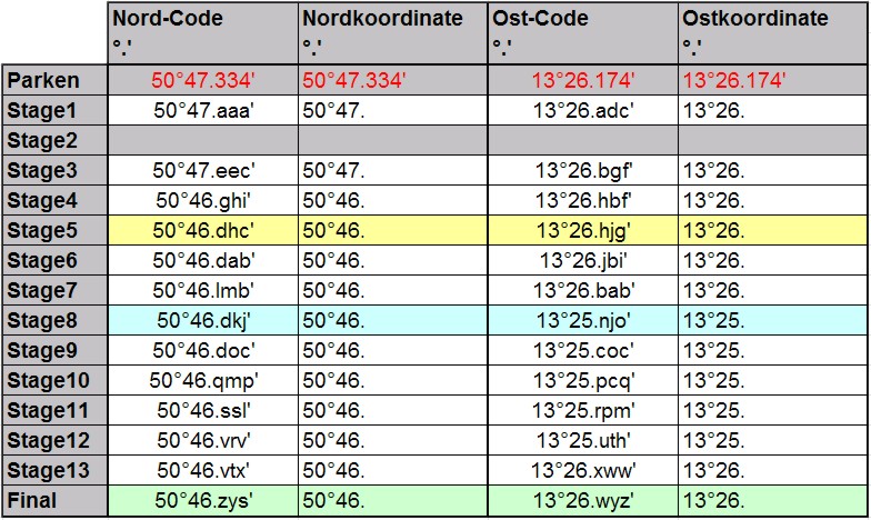 Auf zu Stage11 (N11=N10+G*M+F+H, O11=O10+I+M+A+C) bzw. (50°46.ssl' / 013°25.rpm') . Was könnte hier denn P = … sein? Na klar, die Plätze natürlich. Die benötigst du zum errechnen für Stage12 (N12=N11+E*J+P-L, O12=O11+H*M) bzw. (50°46.vrv' / 013°25.uth')
